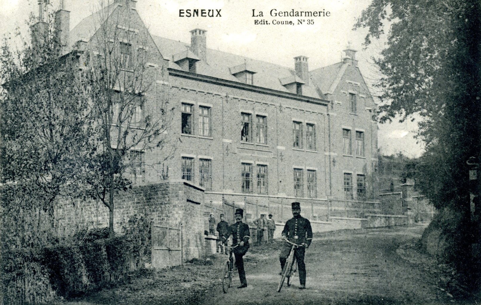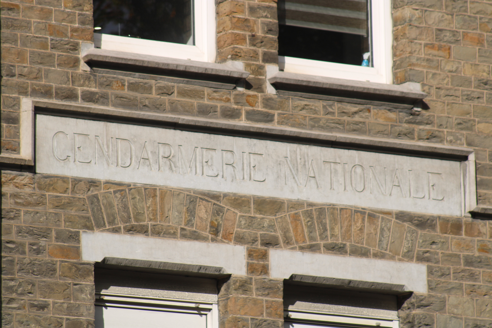 Description: Pierre gravée en façade du bâtiment, ancienne caserne de gendarmerie d'Esneux. Aujourd'hui, le bâtiment abrite des logements.
