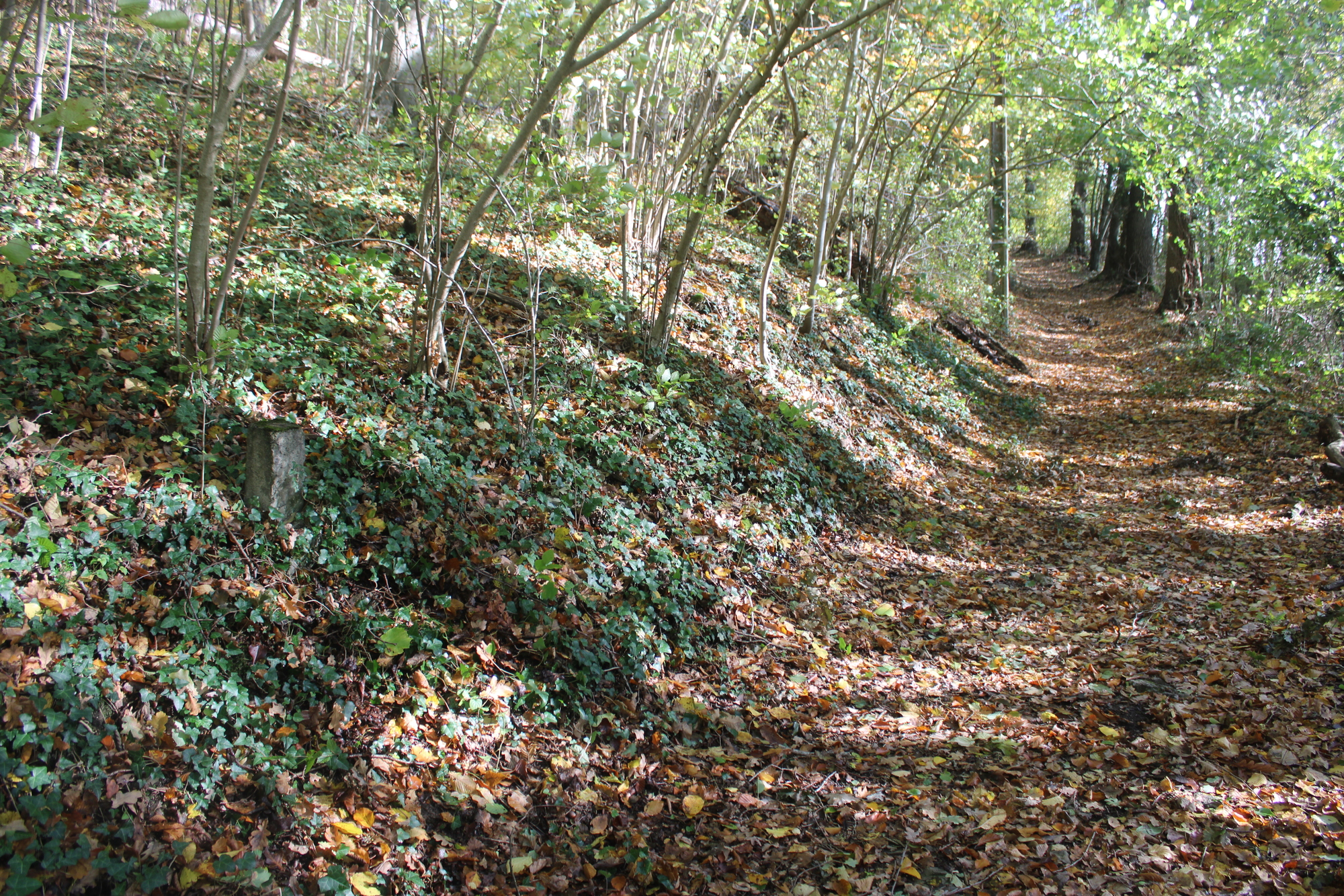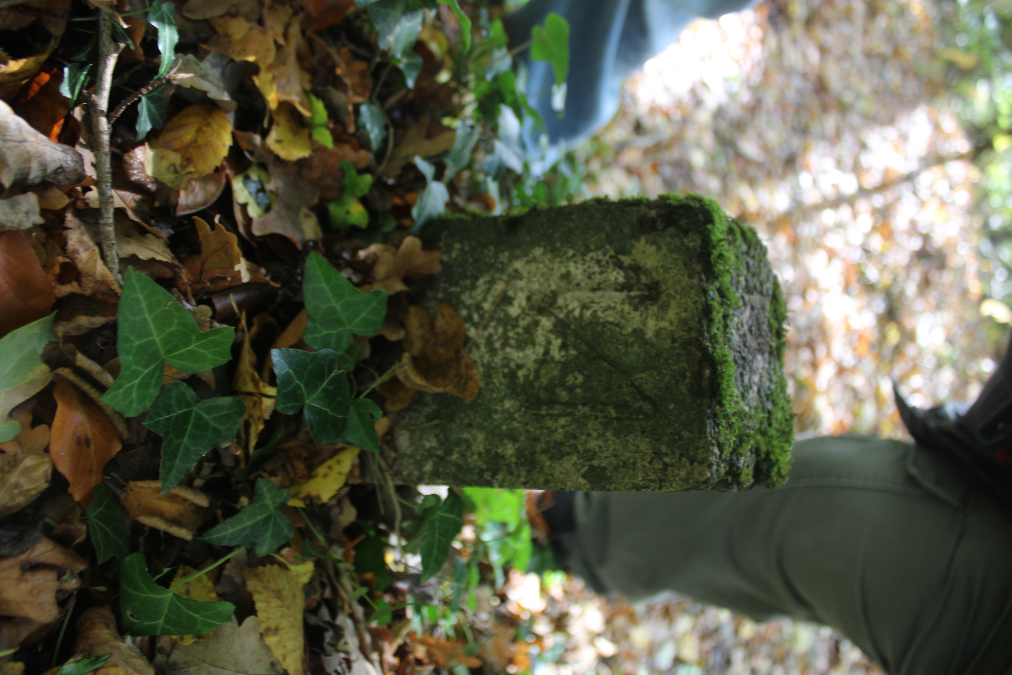 Description: Borne de limite en béton gravée N située au bord du chemin de Rosière