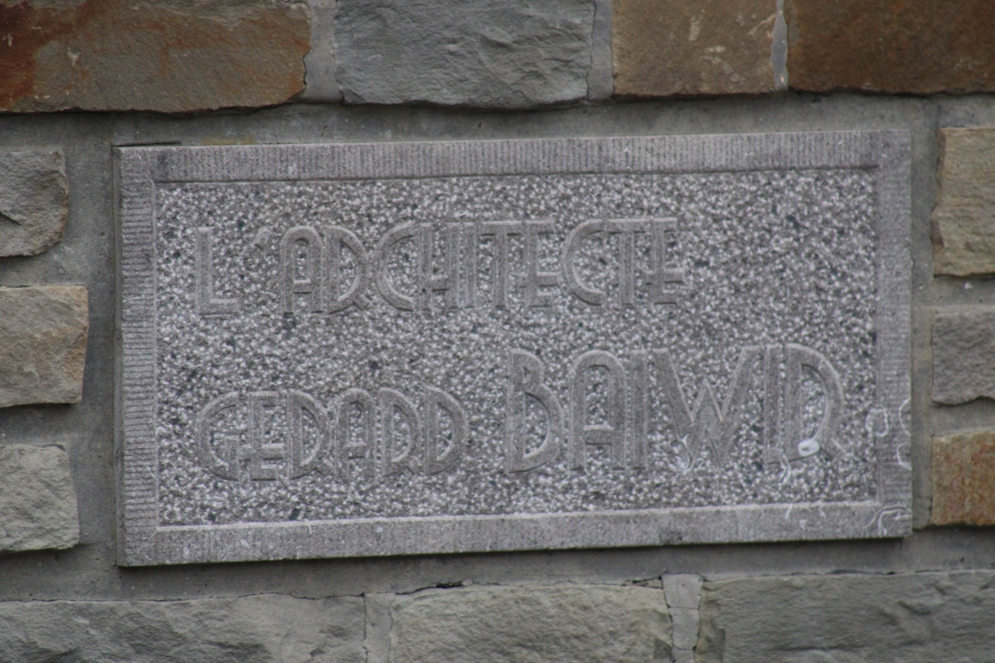 Description: Plaque d'architecte en pierre bleue placée en façade, juste à coté du perron d'entrée de l'habitation