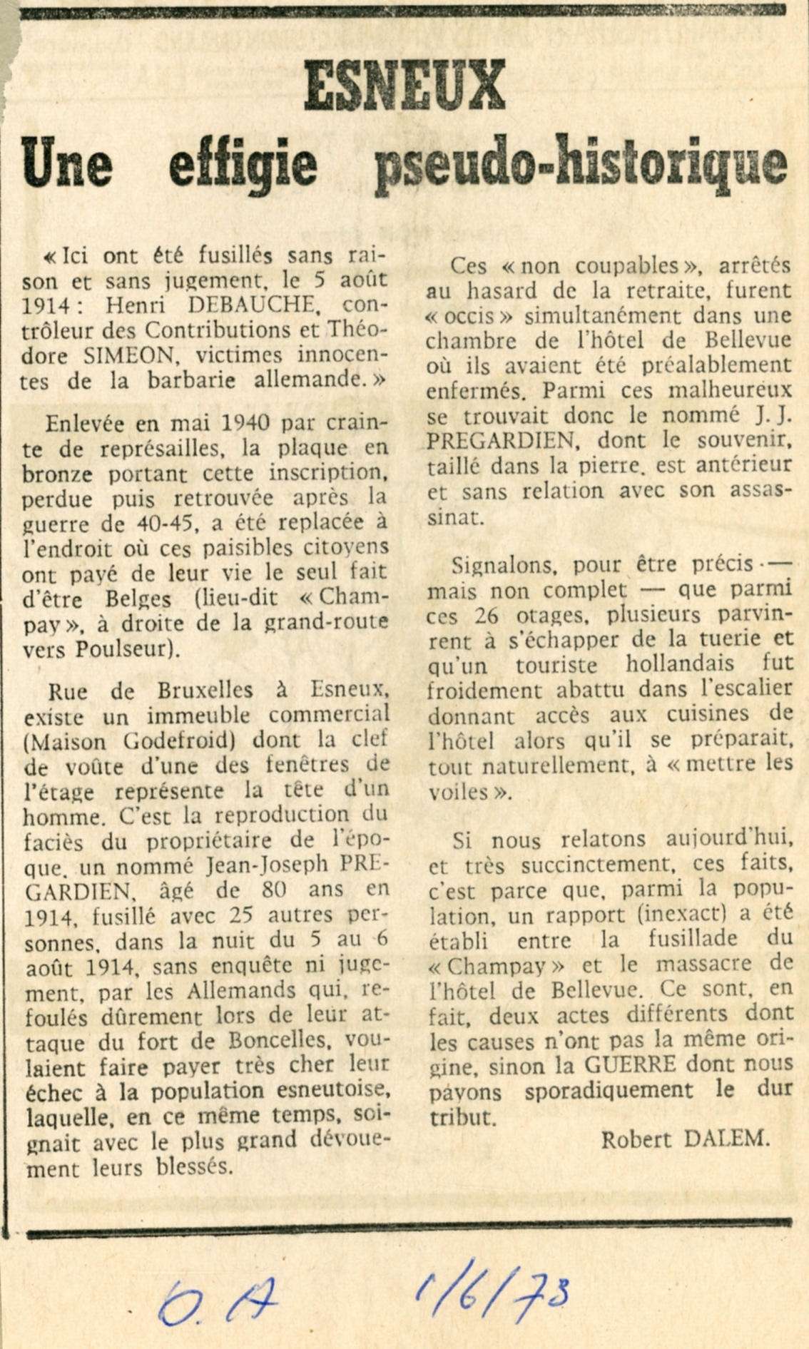 Historique: Effigie pseudo-historique, selon l'historien local Robert Dalem. C'est la clef de voûte d'une fenêtre d'étage de l'ancienne quincaillerie Godefroid. Elle représente le faciès de Jean-Joseph Prégardien, âgé de 80 ans en 1914, qui sera une des 9 victimes abattues par les Allemands dans la nuit du 5 au 6 août 1914 à l'hôtel de Belle-Vue.