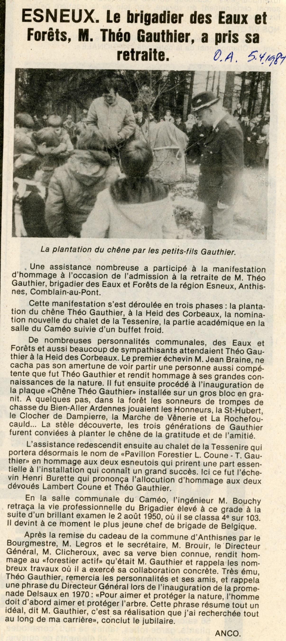 Historique: En même temps que l'implantation de cette plaque le 3 mars 1984 a été planté un chêne en l'honneur de Théo Gauthier, agent des Eaux et Forêts. Ce dernier a poursuivi les engagements de ses prédécesseurs pour conserver à Esneux le titre de berceau de la Fête des Arbres, particulièrement en s'impliquant dans la mise en place de l'arboretum de la Tessenire.