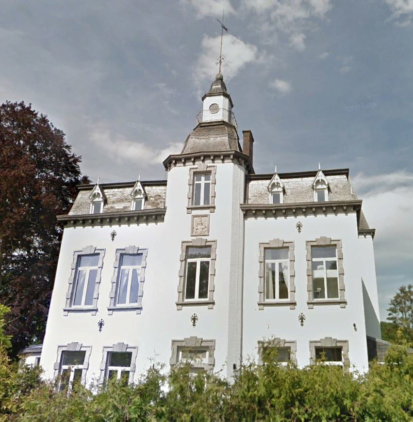 Historique: Vaste demeure construite dans la seconde moitié du 19e siècle, dans un style éclectique à dominante néo-classique. Construction en briques, récemment peintes en blanc. La façade est axée sur une tour à pans coupés, coiffée par une toiture bulbeuse surmontée d'un lanternon, que domine cette girouette.