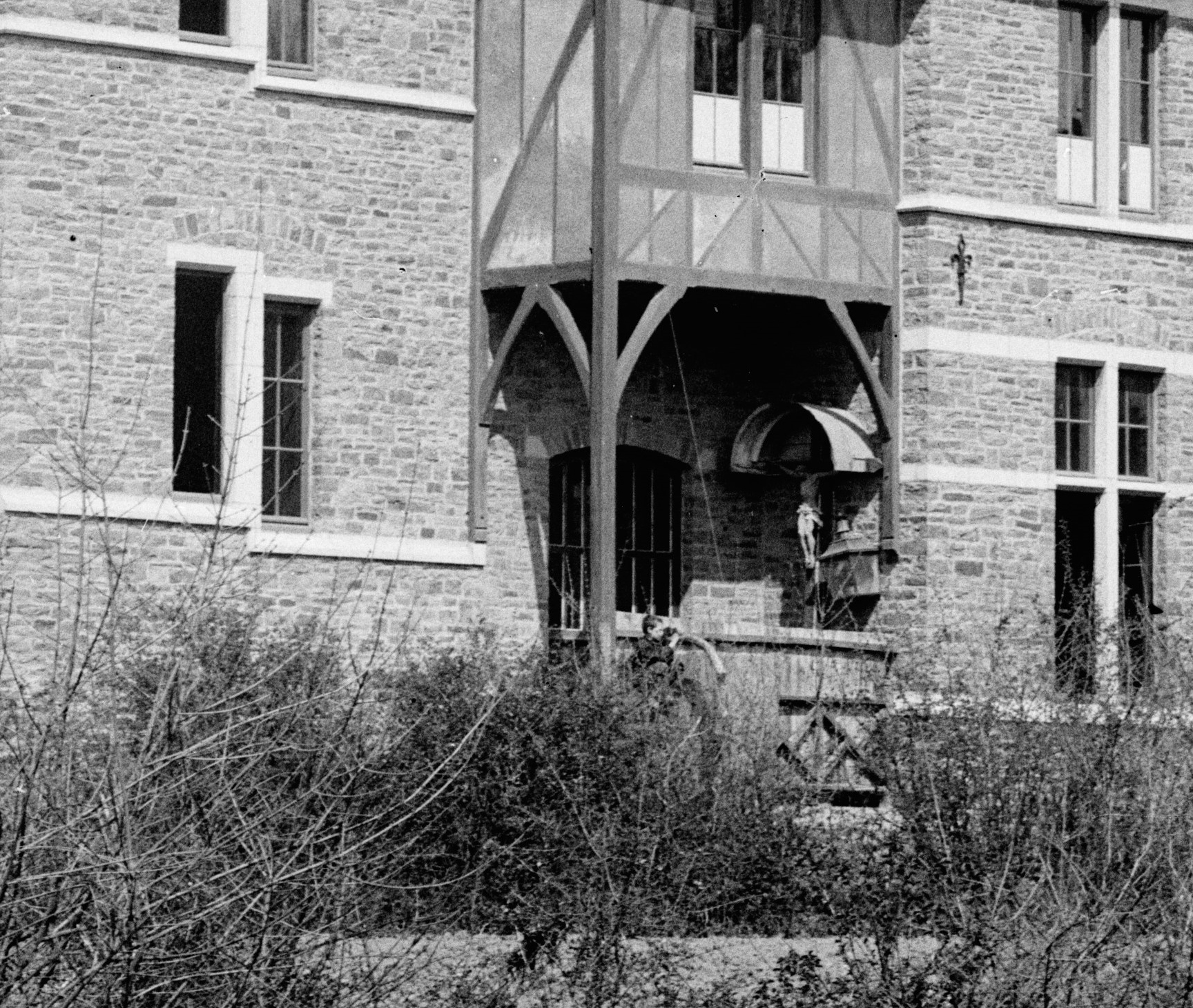 Historique: La croix initiale de mission de 1837 était en bois avec un Christ en chêne et était située à doite de l'entrée de l'ancienne église. Sauvegardée au Cercle Saint-Michel pendant l'édification de la nouvelle église, elle a repris place à gauche de l'entrée inférieure de celle-ci. A une date inconnue, la croix en fonte actuelle a remplacé celle en bois, tout en conservant le socle initial. Le Christ en chêne est aujourd'hui exposé dans l'église.