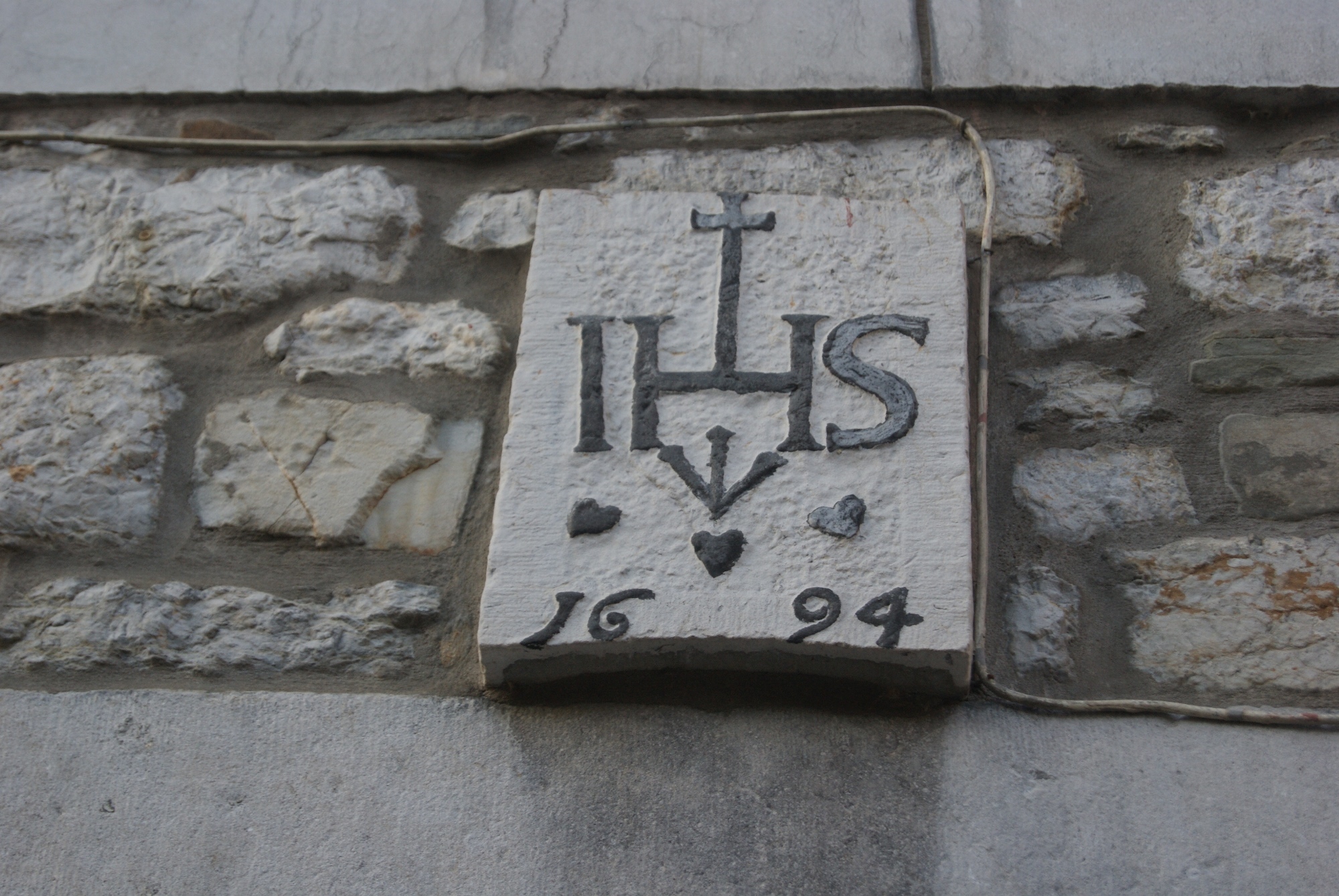 Description: Pierre sculptée située au-dessus de la porte d'entrée, comportant un IHS daté. Inscriptions peintes en noir.