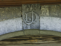 Description: Clef de voûte en pierre du portail d'accès à la cour de la ferme, gravée aux initiales JD (Jules Dallemagne) et datée 1905.