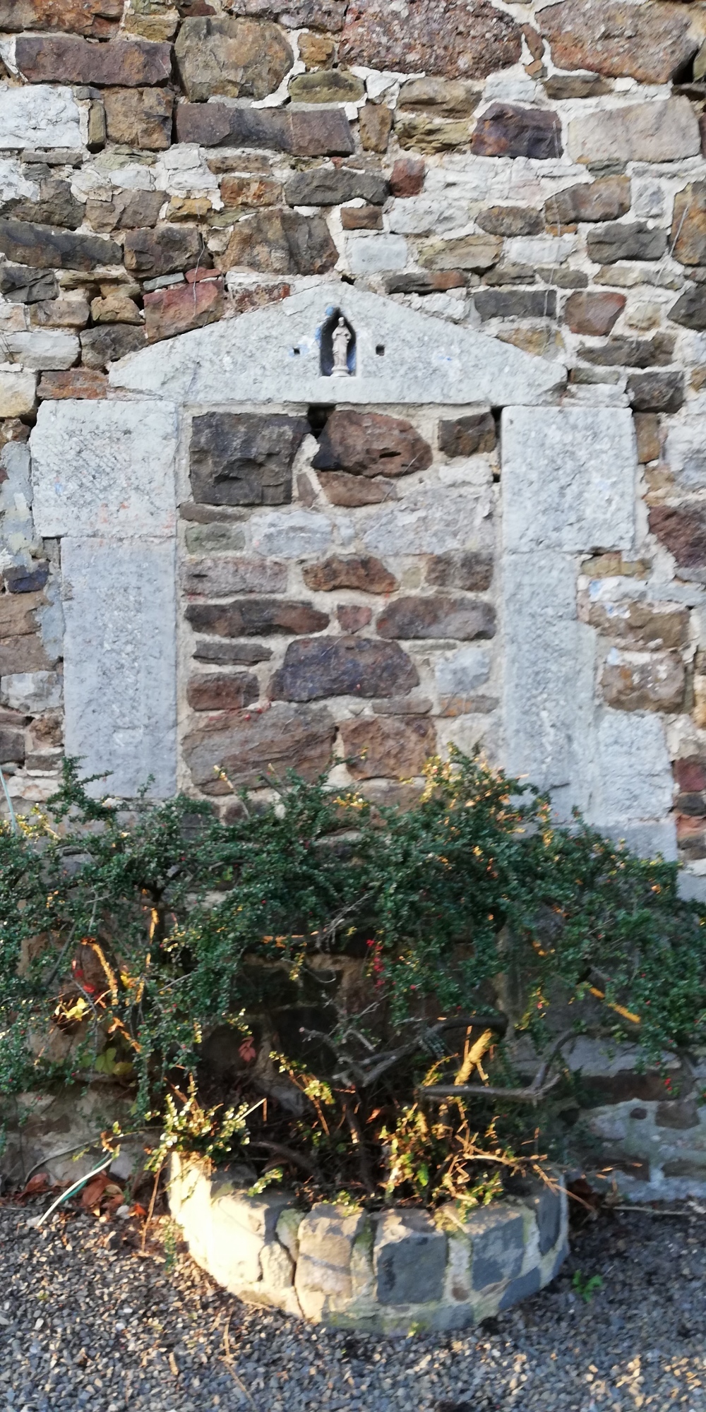 Description: Sur un mur latéral, niche dans le linteau en V d'une porte obturée, abritant une statuette